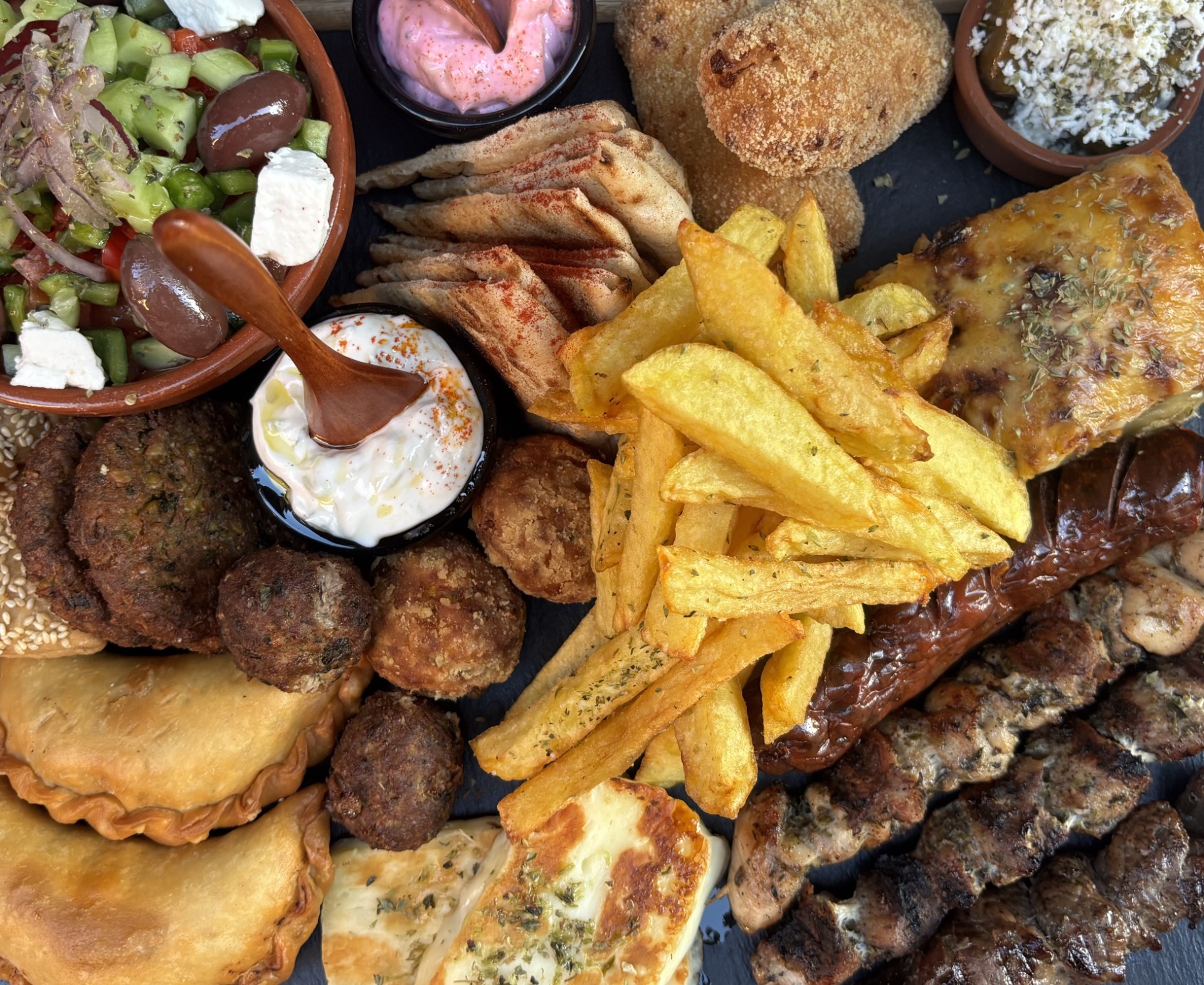 Perfecto para degustar todas nuestras carnes acompañadas de patatas fritas, pan pita, ensalada, salsa tzatziki y mayonesa de eneldo.